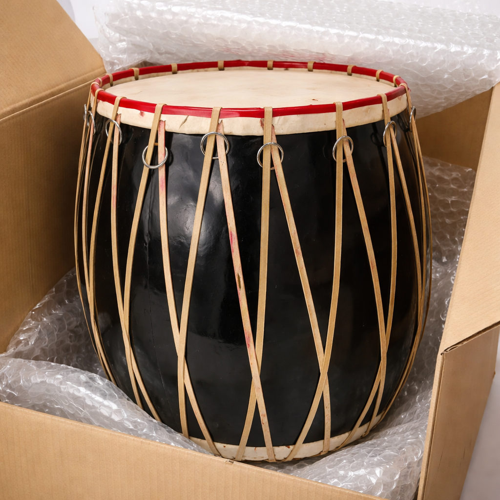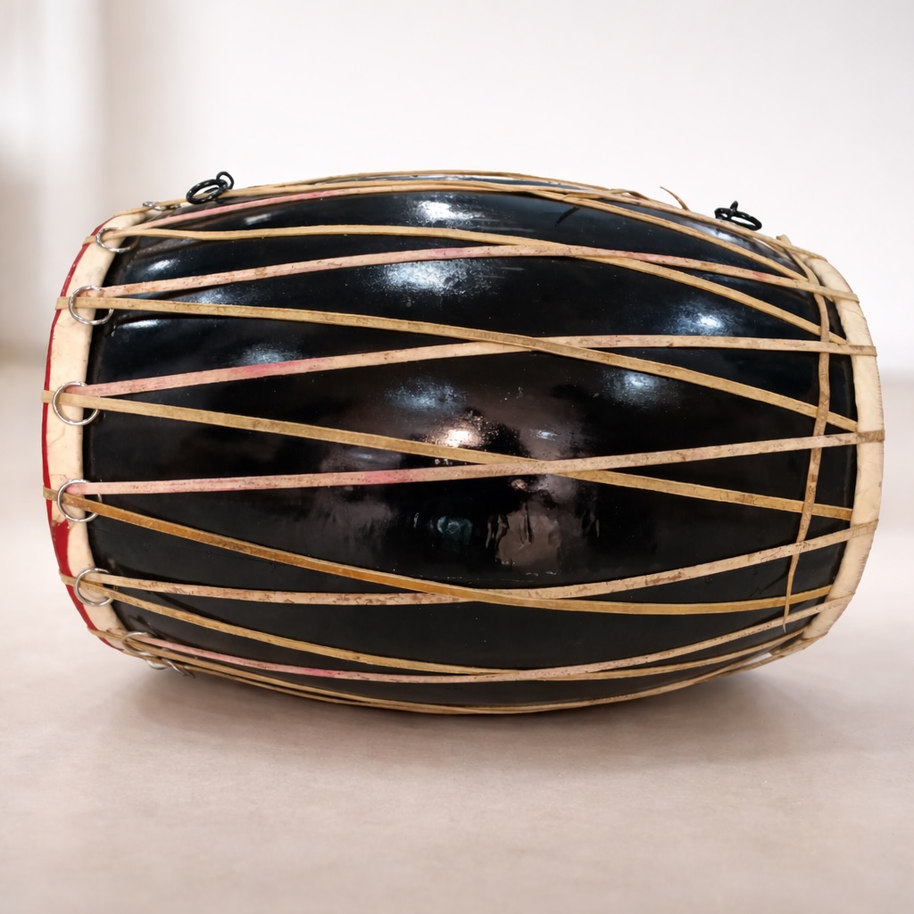 Traditionally, the dhak is suspended from the neck, tied around the waist, or placed on the lap or ground. It is played using wooden sticks, producing powerful rhythmic beats. The left side is specially coated to create a deeper, heavier sound.