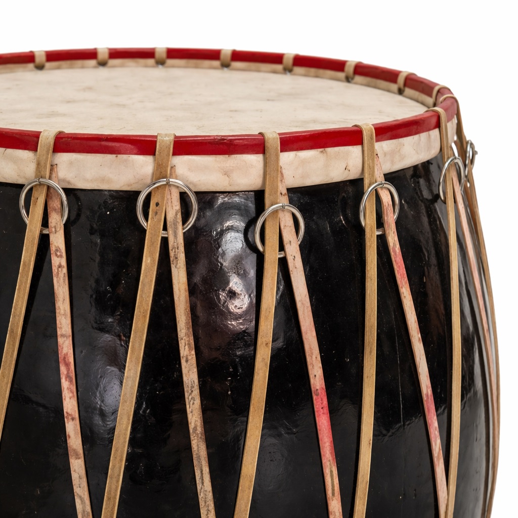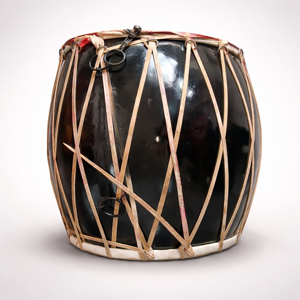 The Dhak is a large membranophone percussion instrument originating from Bengal and Assam. Its shape varies from nearly cylindrical to barrel-shaped, and the methods of stretching the hide over the drumheads and lacing differ by region.