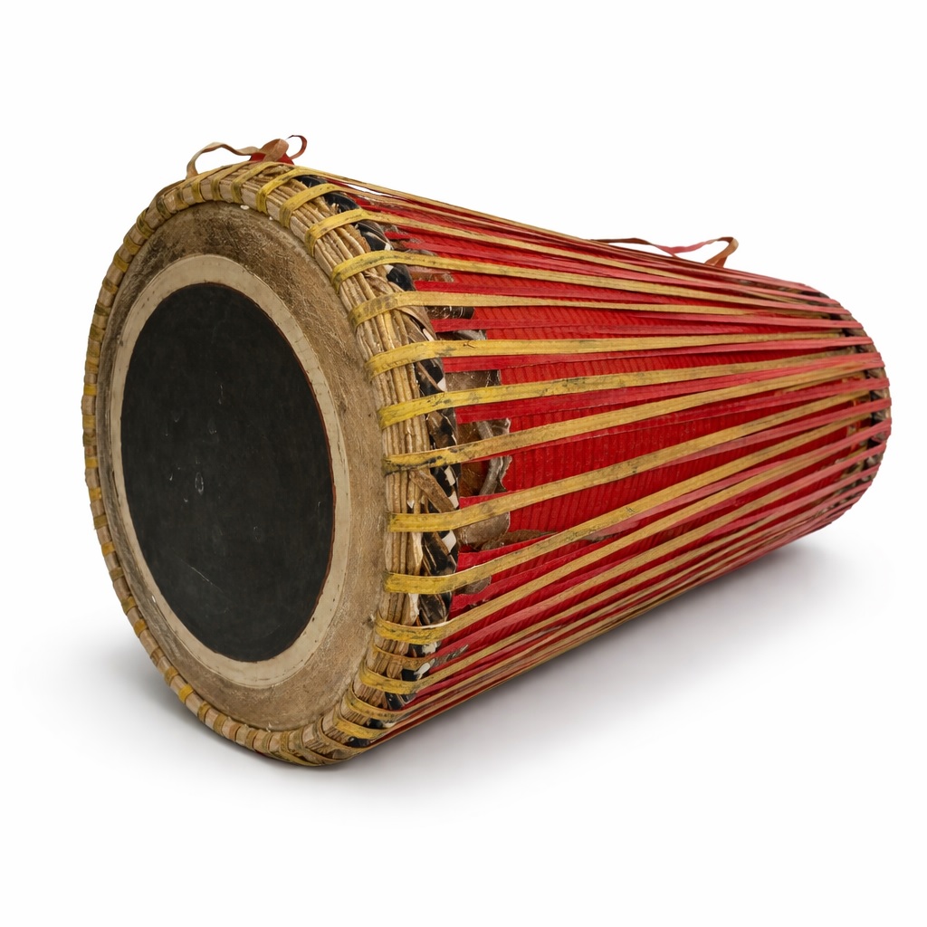 The Madal consists of a cylindrical body with a slight bulge at the center and is closed on both ends. These ends are commonly referred to as “heads,” with one head being smaller than the other. A strand goes around the waist of the player, allowing the instrument to be held horizontally.
