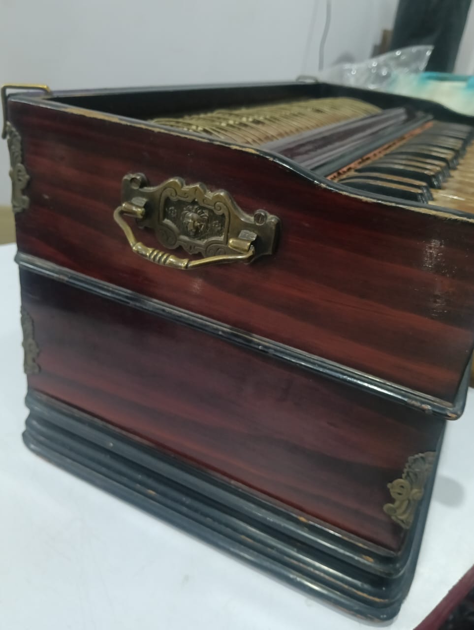 Musical Instrument German Baja 42 Key Multi Bellow 9 Stopper Mahogany Color HarmoniumThis handmade harmonium features 42 keys with a length of approximately 58 cm and a height of approximately 28 cm. The instrument has a reed orientation of horizontal and is made of Himalya Kailwood material with a glossy finish. With an octave of 3.5 and a weight of approximately 10 kg, this harmonium offers a unique and authentic sound for folk and traditional music enthusiasts.
