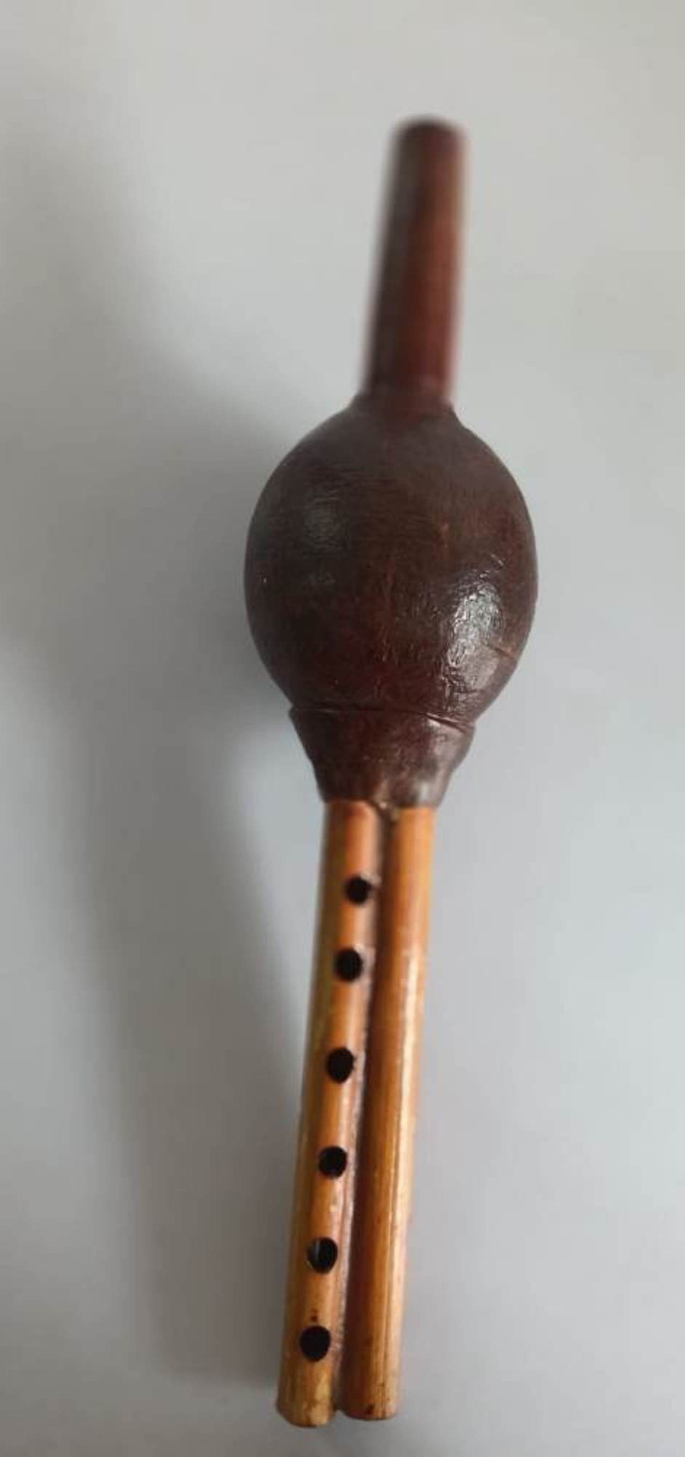 The pungi is traditionally made from a dried bottle gourd. Often, the neck of the gourd is carved for aesthetic reasons. On the other end, two (sometimes one or three) reed or bamboo pipes are connected. These are known as the jivala. One of the pipes has 5 - 9 holes and plays the melody; the other pipe is for drone. The jivala is fitted to the gourd with beeswax, which can be adjusted for pitch modification.