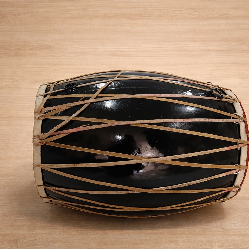Traditionally, the dhak is suspended from the neck, tied around the waist, or placed on the lap or ground. It is played using wooden sticks, producing powerful rhythmic beats. The left side is specially coated to create a deeper, heavier sound.